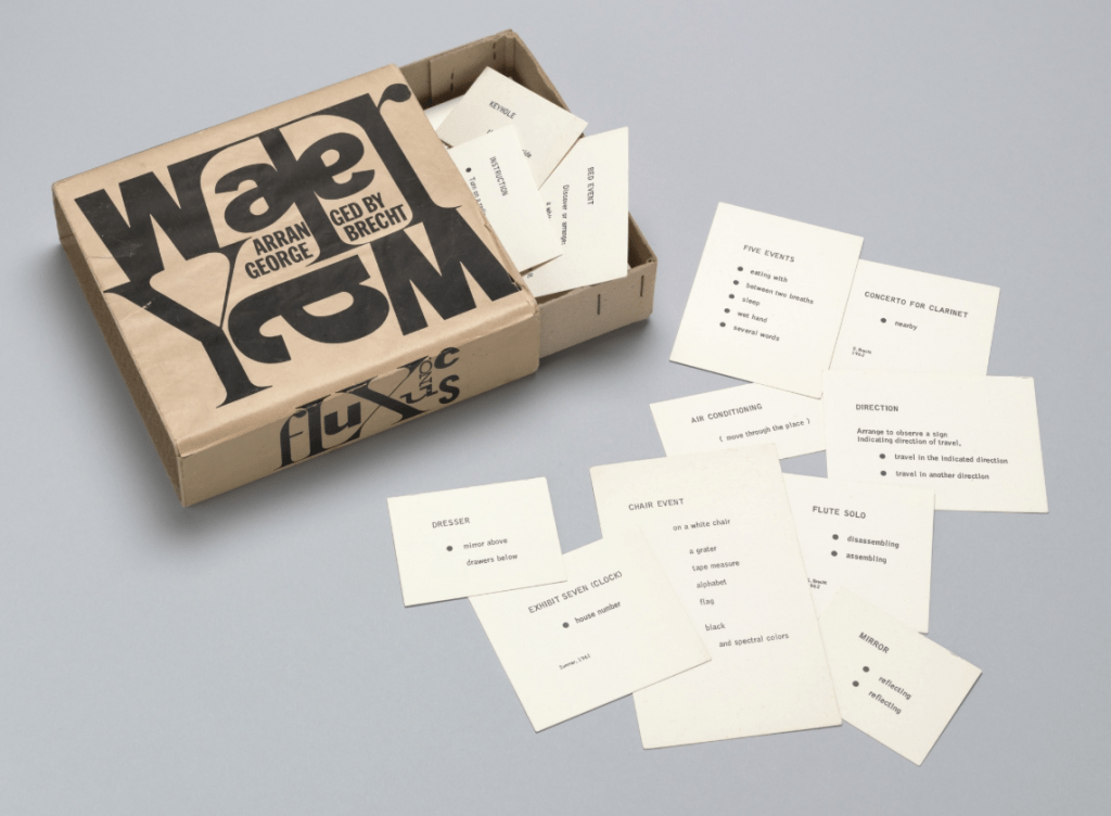 This had me recall the work of Brecht, where he had a box or card system of instructions that you could take from. This reminds me of board games, such as Cranium or Pictionary, where the player is given instructions and often other players have to guess what was on the card. It also reminds me of notices placed on notice boards, where there are tear off contact details at the bottom, or of ticket machines at deli counters etc, where the piece of paper you have taken affects the result for the next person (by removing the previous number in the case of tickets, or reducing the number of people who can take the contact details from the notice). Or even fortune cookies, whereby a ‘personal’ script is found inside each one. It could be interesting to explore these different modes of presentation for my work.
