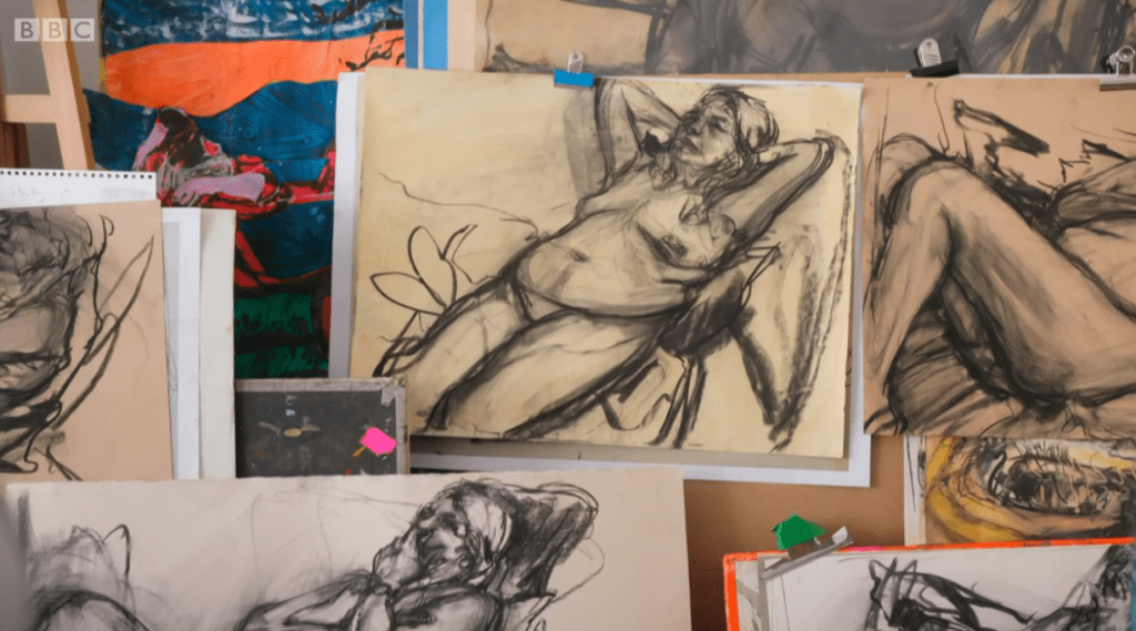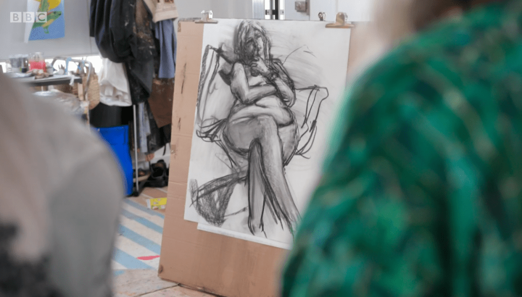 Mary is still aware that some viewers are going to think ‘Did she have to?’ about her being a nude model – implying again that she feels herself an undesirable sight, “whereas I feel quite sort of, slightly brave about doing this”. It is literally bearing all in front of national television after all! Something I think many people would outright refuse to do. But it is interesting she is surrendering to this vulnerability and displaying that most private view of herself. Having sat for Catherine twice, on her third visit Mary allowed the cameras in, and admitted to being nervous.