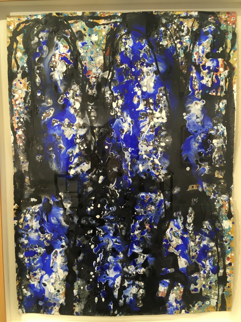 I chose Ultramarine colour to experiment with, as I believe it the nearest to the blue of Yves Klein. I wanted to repeat to some extent the gesture used in my charcoal piece – the pushing element I thought might be interesting explored in a more fluid sense. Perhaps in my execution I was more focused on the pour (I did not perform this with my eyes closed, though perhaps I should repeat this with them shut!) and so there is less forcefulness in my gesture. It seems more meditative.