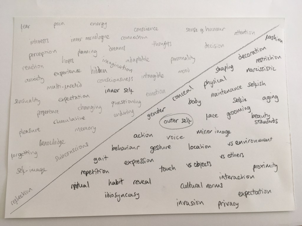 I already had established I wanted to explore self-expression in my final major project, but I needed to get a broader view of what directions I might explore. I began by considering the different associations of the inner and outer self, to understand how I might investigate their relationship.