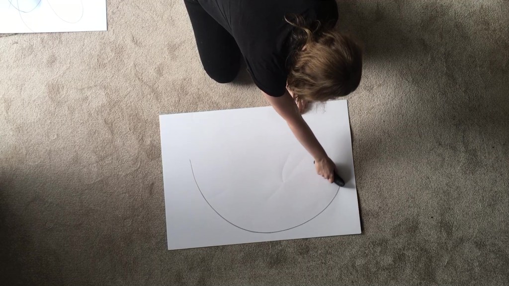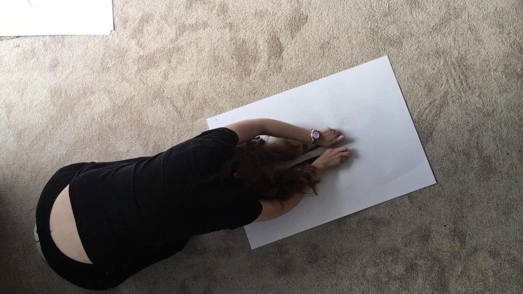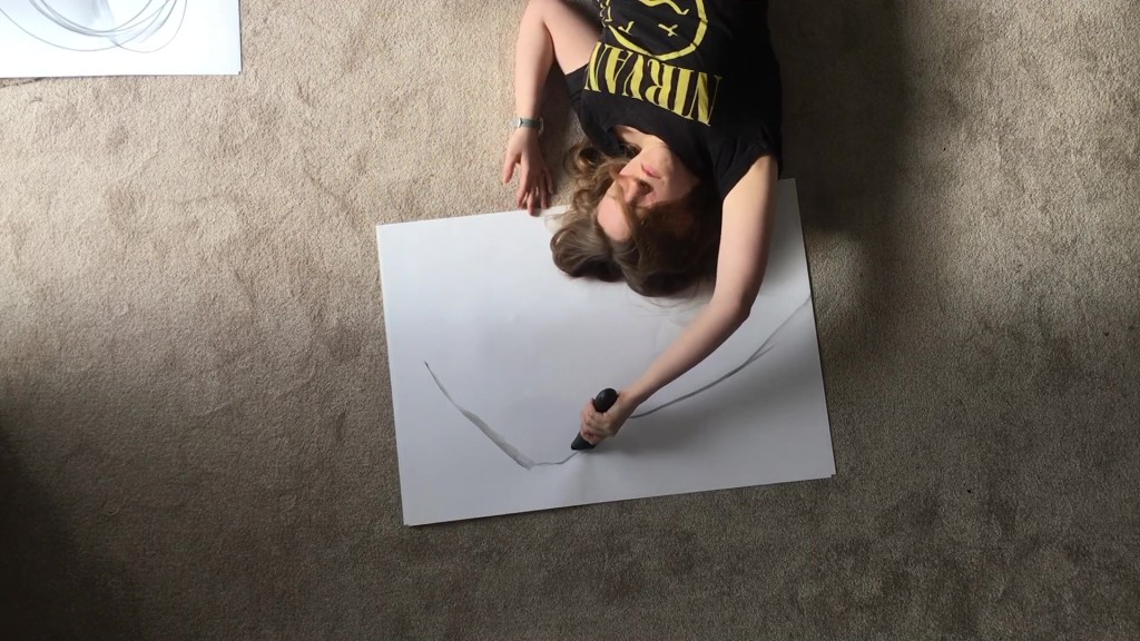 My first challenge was in erecting some way of filming the process from above, as I do not own a tripod or the special craning equipment that would be used by professionals. I discovered a DIY instruction for a cardboard cradle of sorts for my phone that could be affixed to the ceiling using masking tape, and used this for some drawing experimentation in my sitting room. This floor is carpeted, which would mean it less than ideal for paint work, but does give me the most floor space in which to work.