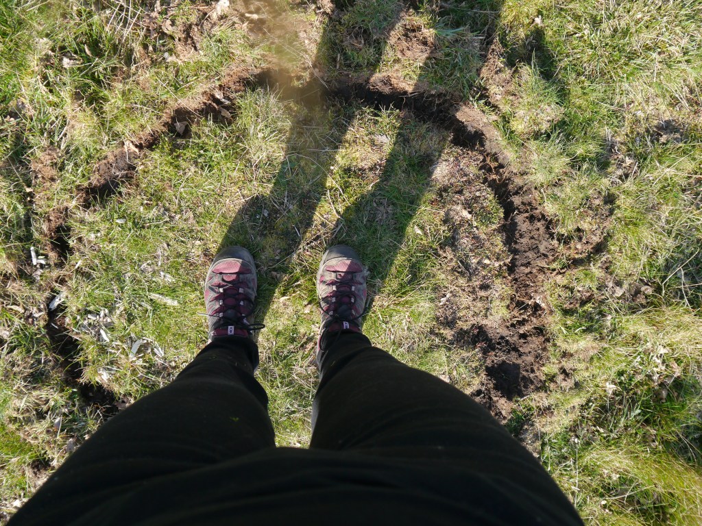 Following my reflections on self-isolation, making oneself an island, in this current climate of coronavirus lockdown, I wanted to experiment with creating an earthwork in performance. A moat, while ostensibly being a body of water, is first an earthwork – involving the movement and construction of large amounts of earth. I planned that this should primarily involve my push gesture, on my knees, arms extended, pushing the earth away so that it would create a trench and a mound encircling me.