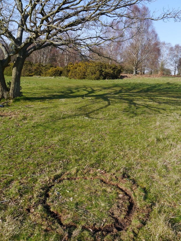 Map of Northchurch common, with the earthwork marked in the centre.The tree from which I hung my camera, and my completed earthwork – I considered whether to make use of the long shadow of the tree but decided it best to allow focus on the process/form itself of my constructing.