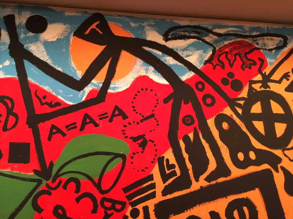I appreciated understanding a little more of the narrative within the Edinburgh mural from the curator Lena Fritsch, though I think a much lengthier talk would be needed to grasp all elements of this large scale work fully. She drew our attention to the elements featured which captured something of the zeitgeist from 1987 (when the painting was created on-site at the Fruit Market Gallery in Edinburgh). The middle image above shows two standarts (each holding a different letter) coming together – symbolising the softening of the cold war, with American and Russian interests meeting to discuss disarmament during this time.