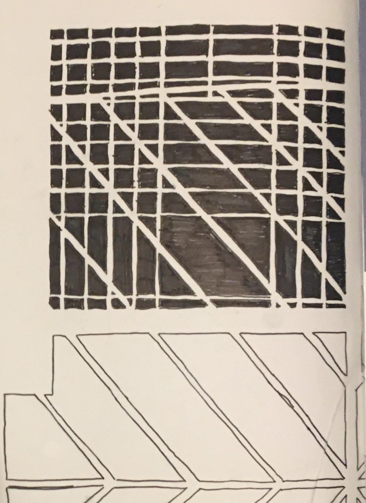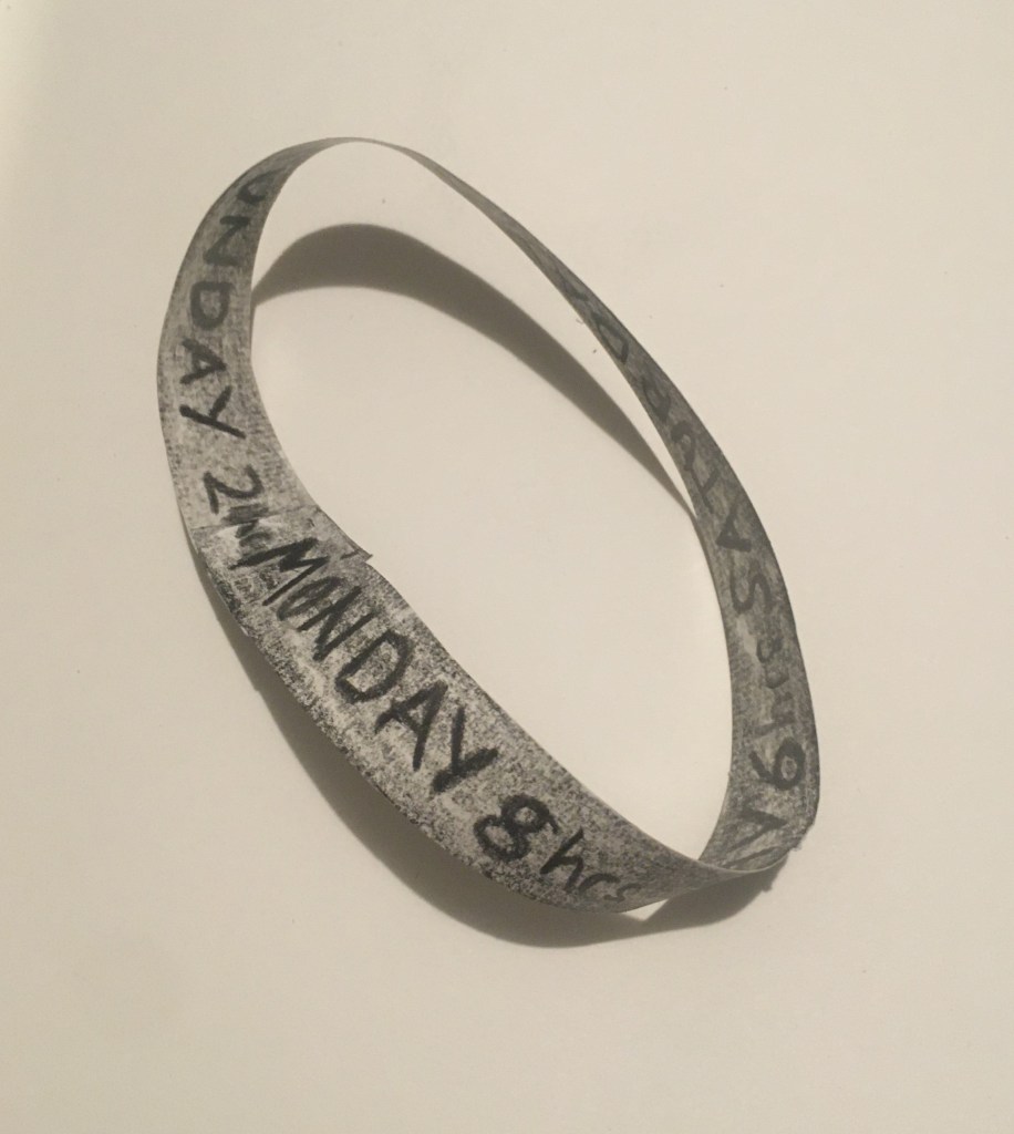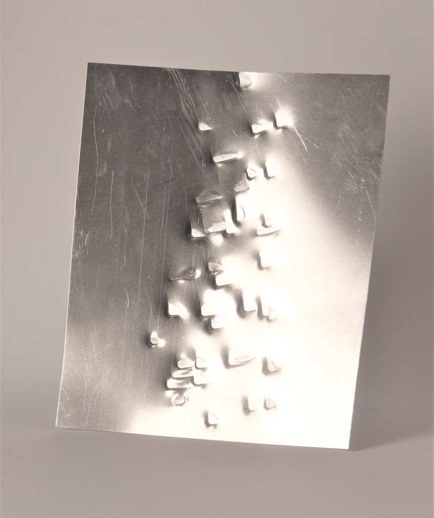 I hit it 39 times, to reflect the number of hours of screentime over the 7 day period. The marks of the hammer I used here reminded me of those I had created in my previous exercise using pastels. I like how the surface of the sheet has also distorted somewhat from the force of the blows, warping it and the way the light reflects off it.