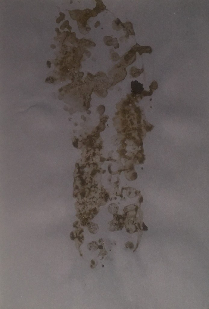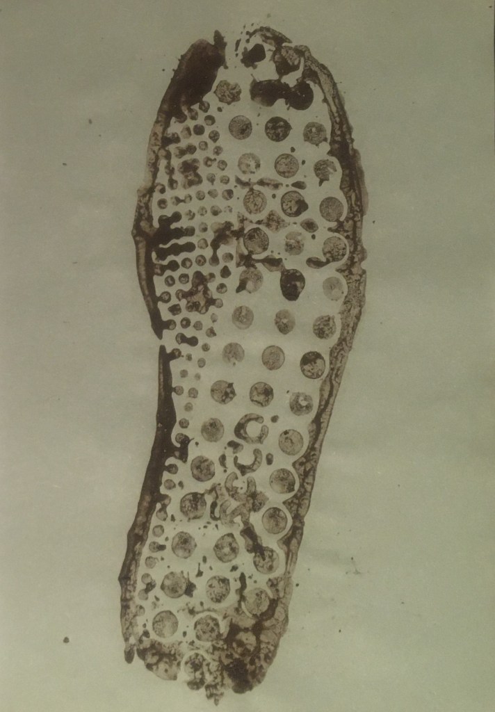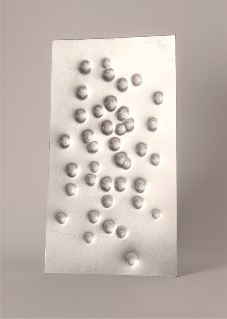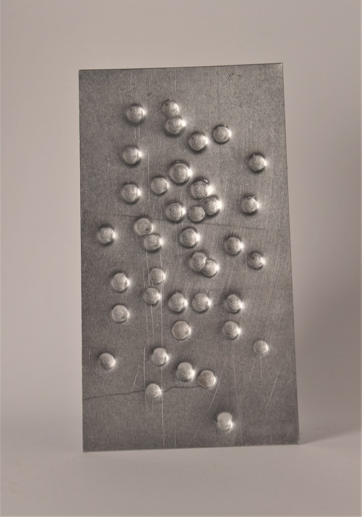 I wanted to experiment with a round headed hammer, to see if I could produce marks that were similar to a thumbprint, so repeated this. The effect reminds me of bullet holes/impacts in shooting targets, and gives an added sense of violence.