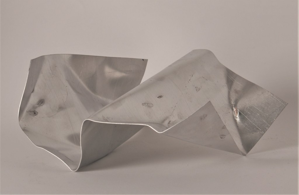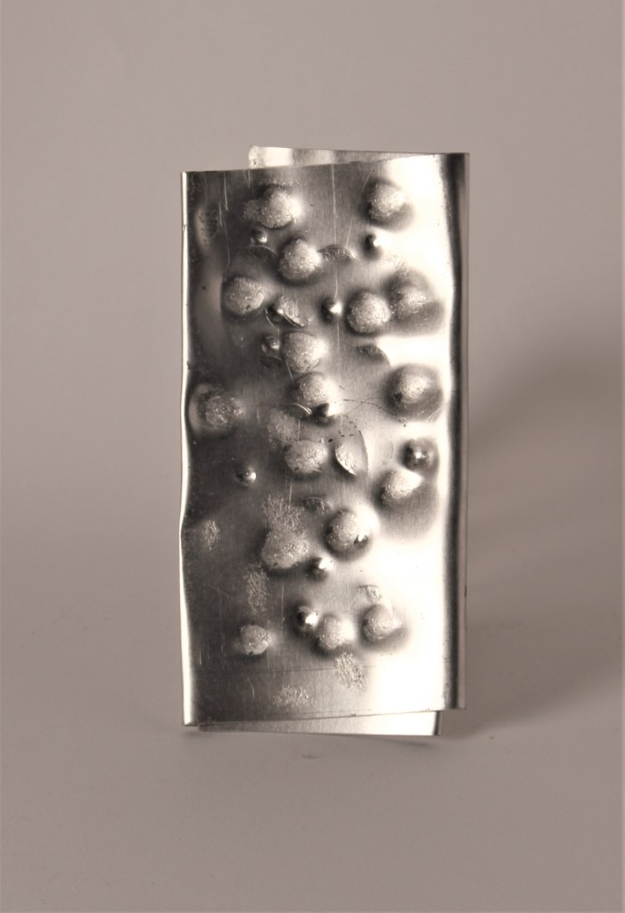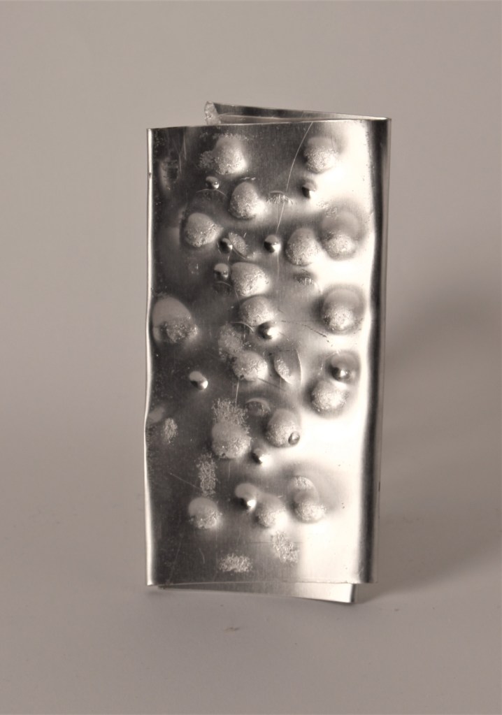 I was interested in exploring the reflective qualities of metal sheeting as analogous to that of screens, in visualising my screentime data. I was shown offcuts of aluminium sheets that I could use to experiment with. Following the performative clay work I had done, I was eager to incorporate this again, and decided that manually hammering it over an anvil would be a satisfying process to try out. In this way I could again demonstrate the human-screen interaction and also something of the strong impact this has on our lives (for better or ill). This turned out to be really fun!!