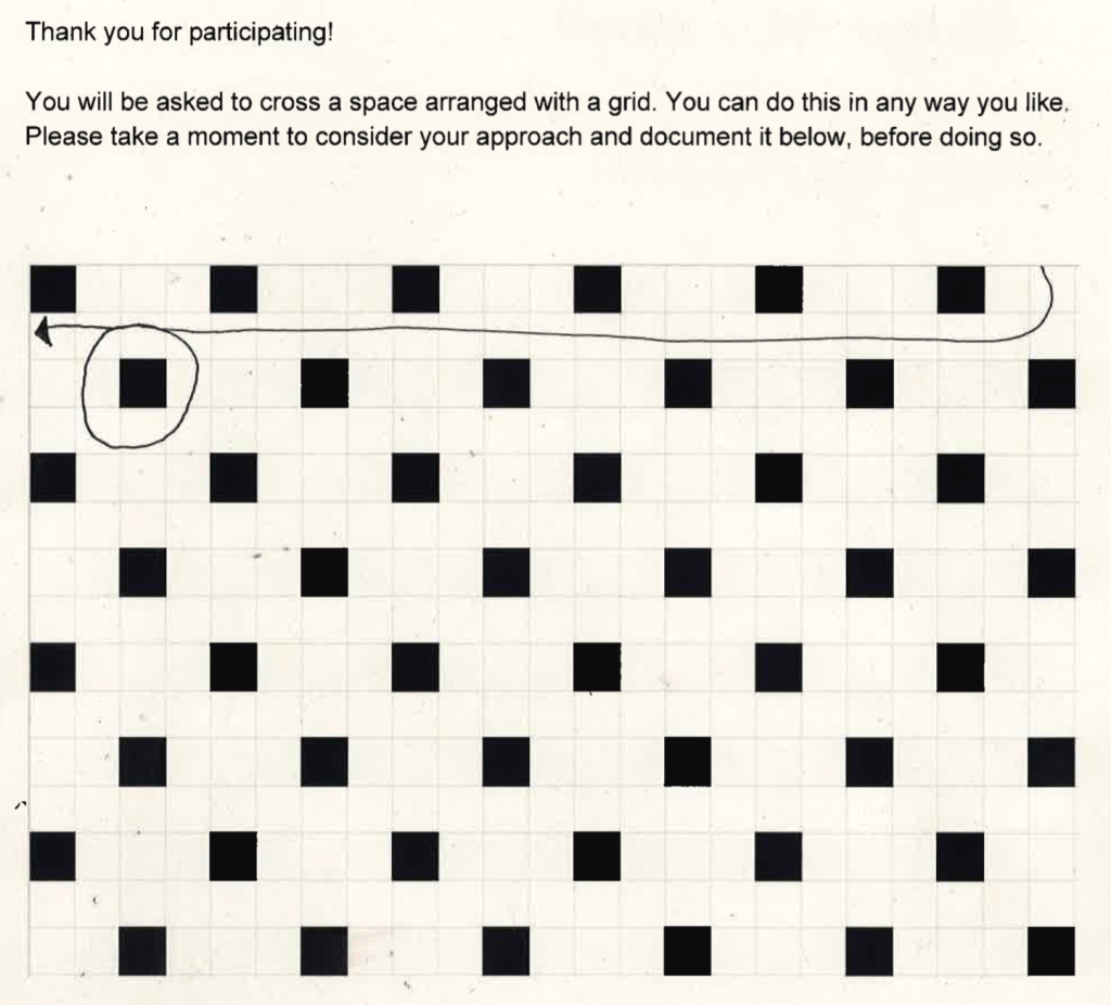 Participants were first asked to plan their route across the grid on an exercise sheet I provided. I intentionally did not provide a scale or inform them of the side of the grid they would enter first, or reveal the location of the grid within real space. Once they had drawn this, I brought them to the end of the corridor where they would approach the space and let them do so unassisted.