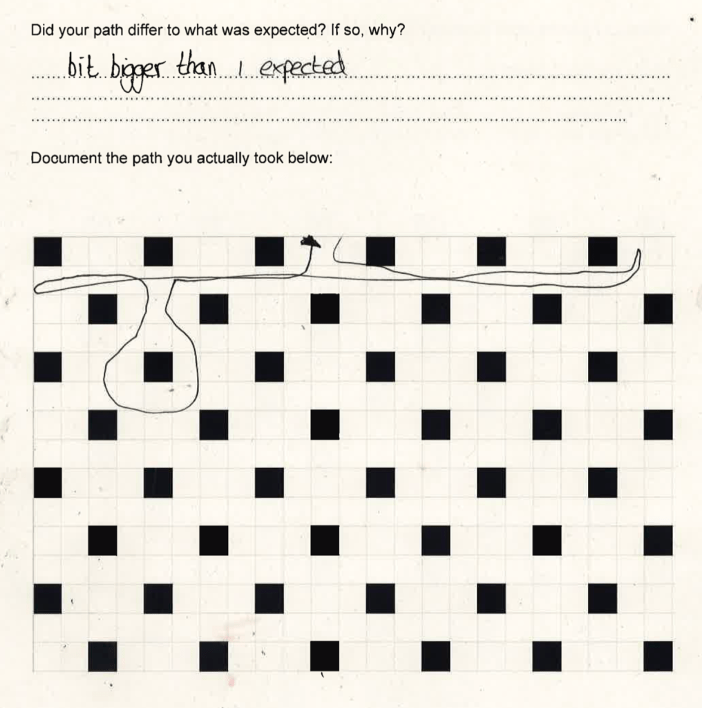 An unexpected observation was the change in participants’ mental states throughout the exercise. There was a certain nervousness and confusion when first being instructed on the task, and uncertainty in the chosen route. Some expressed some frustration on discovering the grid was unlike the space as they had imagined. There was a general sense of focus and concentration during the task, followed by a sense of achievement and enjoyment on completion of it. If I were to repeat this I think I would seek to find a way to record this change in mental state more fully, as this anxious anticipation could be a natural state of future thinking.